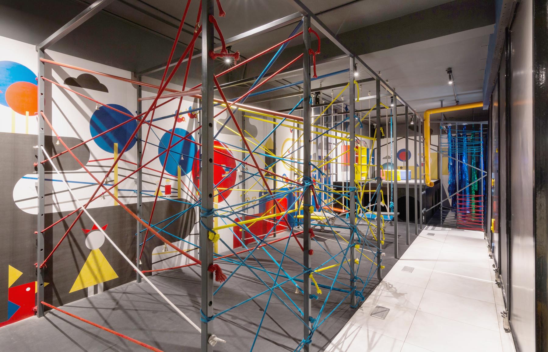 This is a venture to bring in all that energy, playfulness and a little bit of competitiveness into a secure indoor scenario. It is a simple composition of circle, triangle, square in primary colors, that invites us all to re-live all our childhood fantasies… jump on the blocks, swing from the ropes, hop under the tires, crawl into the tunnel, slide on zip line, climb on the poles and of-course a lot of other monkey business. There is a sense of rusticity and adventure to the space, where falling and getting up is a part of the play.