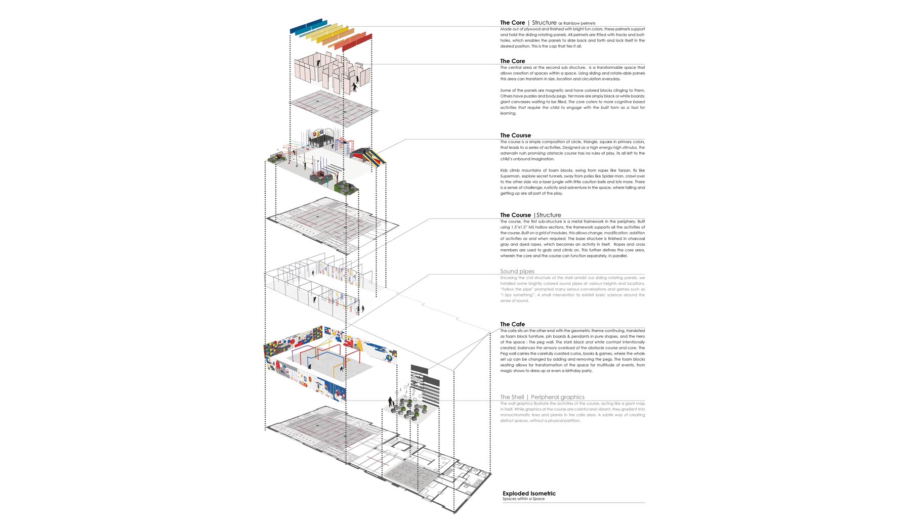 The central area: the core is a hall filled with sliding, rotate-able panels that can transform in size, scale, location, circulation and the space everyday. The panels slide along the pelmets and rotate 360 deg. Some of the panels are magnetic and have colored blocks clinging to them. Others have puzzles and body pegs. Yet more are simply black or white boards: giant canvasses waiting to be filled; all left to ones imagination. The hall transforms itself into an art class session, theatre stage, and a story telling night or simply an unending maze full of activities in every corner.