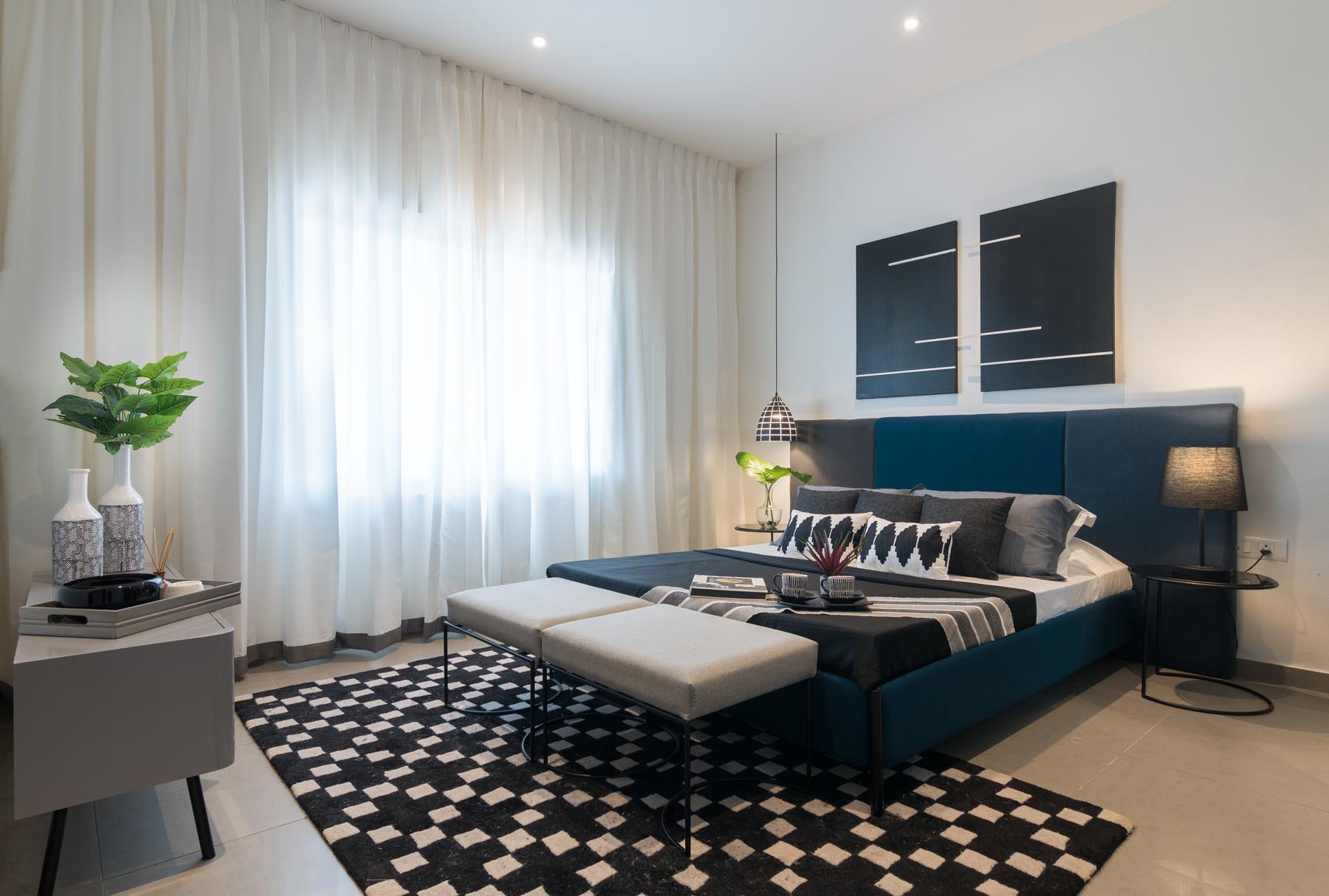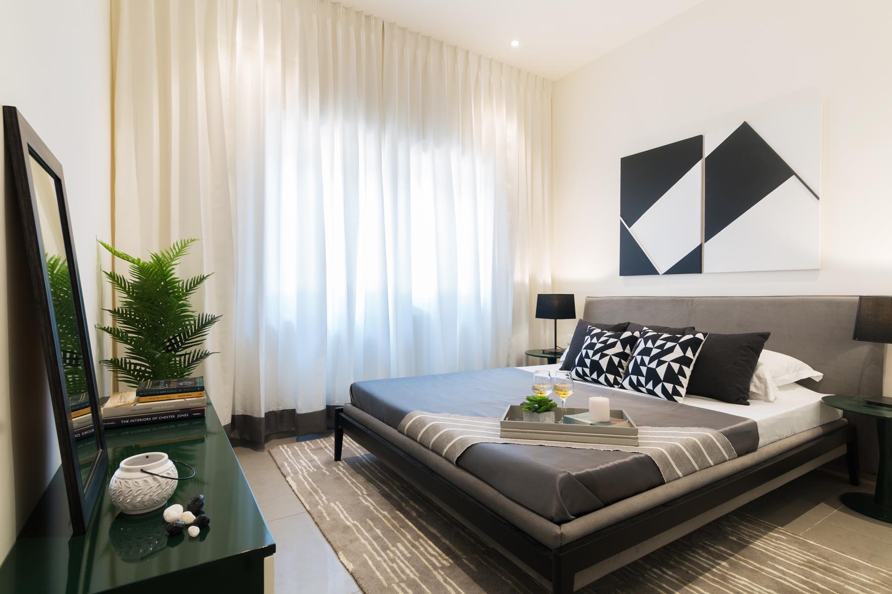 The white shell is contrasted with black lines combined with the undertone of grays and a somber cool color palette. Keeping the shell in stark white paint, the colors and the textures were brought in the furniture and accessories. Matt lacquer finishes are used on the wardrobes with black tinted glass and mirror adding that reflective contrast. To complete the visual graphic we customized bold prints and patterns in loose cushions and painstakingly sourced the furniture, art & carpets to complement the look.